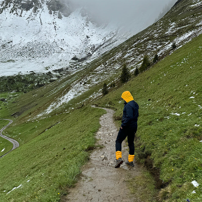 Wear Hikas inside your shoes, not over. They compress inside but expand over the top. Hikas keep out dirt, snow, sand, and ticks. A super-thin stirrup keeps them in place, and a simple drawstring makes sure they stay snug. Think of them like a cozy sleeping bag for your ankles.