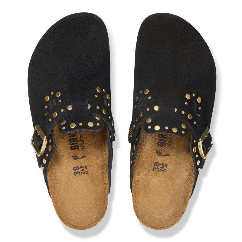 The women's Birkenstock Boston Rivets is a timeless, year-round classic clog known for its adjustable fit and iconic design. This version features subtle, backless rivets set securely into soft suede, offering a comfortable, second-skin feel with a distinctive touch.