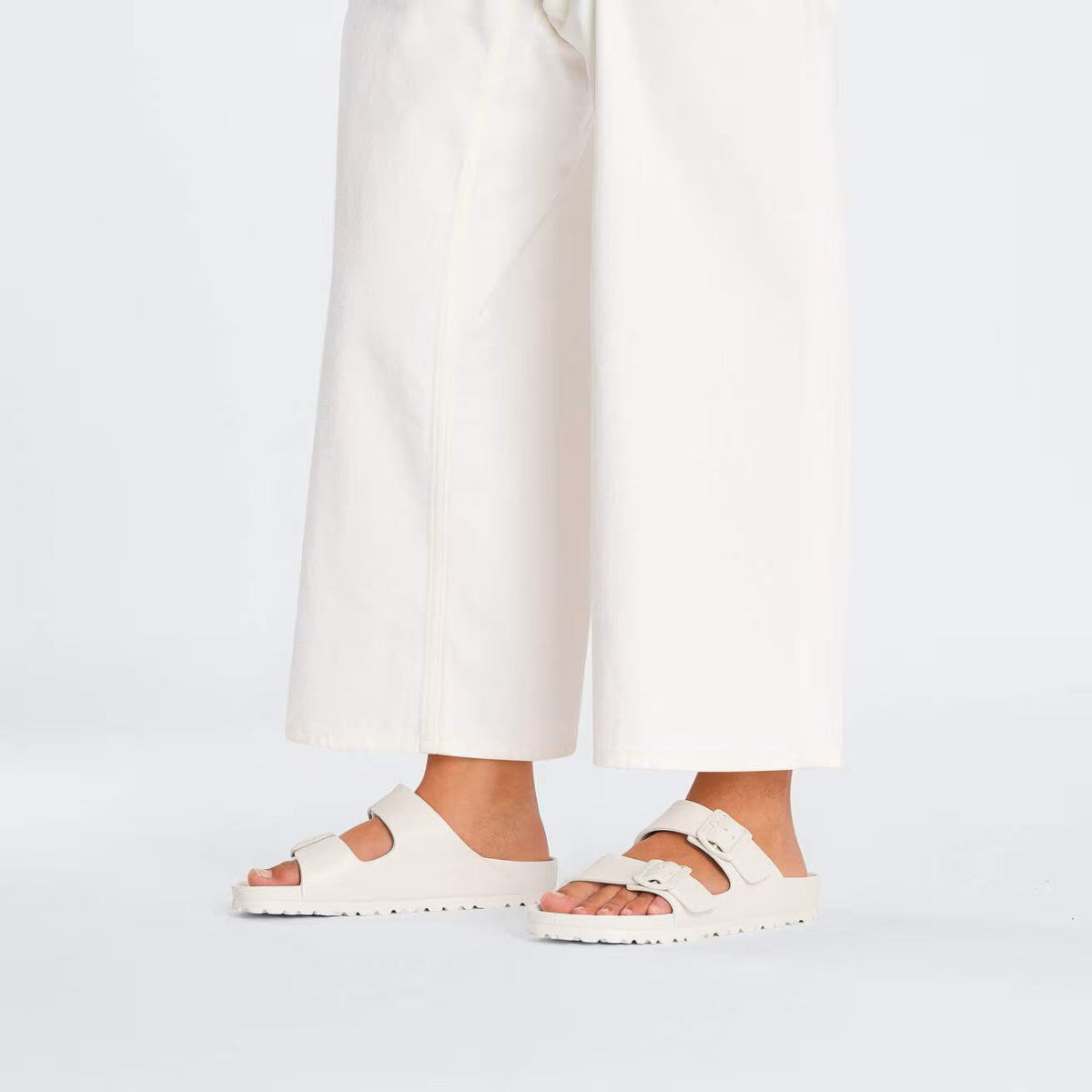White eva sandals styled with white pants