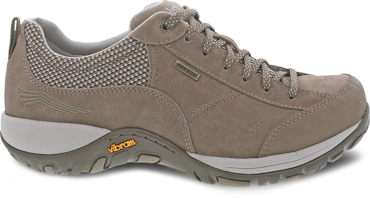 The women's Dansko Paisley walking shoe is perfect for everything from a light hike up the trail to shopping along cobblestone streets. This waterproof lace up offers tons of performance features including a Scotchgard™ treated upper; a breathable, waterproof membrane; DuPont Sorona™ for moisture management; CleansportNXT™ for odor control; and a Vibram rubber outsole suitable for both dry and snowy surfaces. All day support is a given with the removable, triple density footbed embedded with Dansko Natural Arch™ Technology.